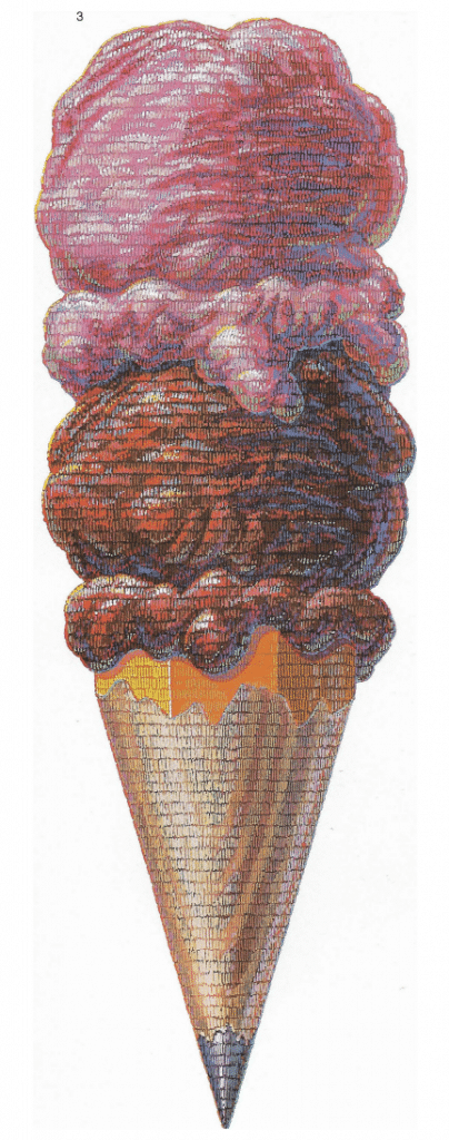Também podemos virar a folha de ponta cabeça, de lado, inclinada. Como acontecia com as nuvens, a cada novo ângulo as imagens se transformam. Ao primeiro olhar, vemos um sorvete, que parece uma casquinha com duas ou três bolas, mas não é. Quando viramos a folha ao contrário, parece um palhaço com chapéu pontudo, mas não é. Se olhamos na horizontal, o chapéu parece a ponta de um lápis, será que é? E aquilo se torna um desafio, um jogo, até saciar a fome de imagem.