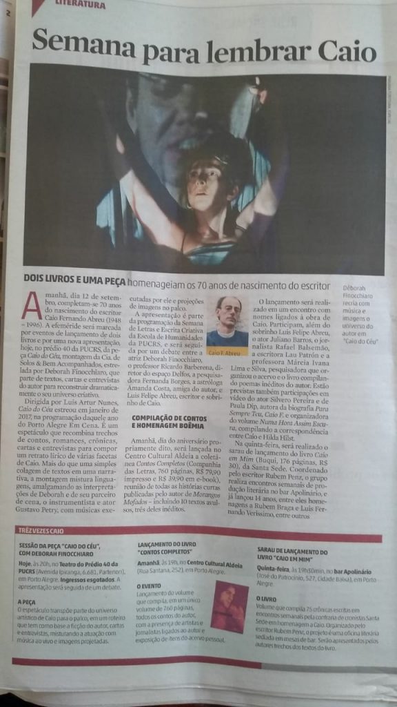 [vc_row][vc_column][vc_column_text]Na Zero Hora de hoje, 11/09, reportagem sobre a Semana Caio, abrangendo alguns eventos comemorativos aos 70 anos do escritor. Na programação, o lançamento da coletânea “Caio em mim”, da Oficina Santa Sede, no próximo dia 12/09, no apolinário Bar em Porto Alegre.